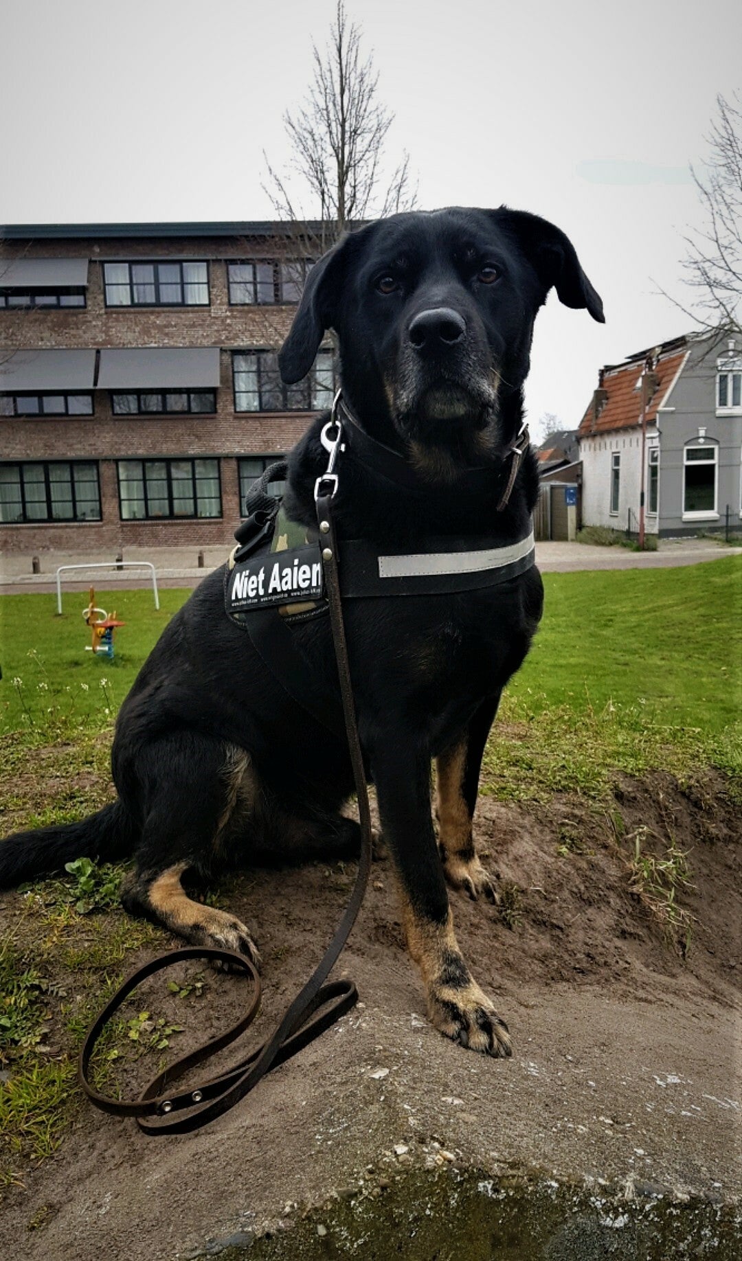De reden dat ik het gebruikt is, omdat het een handig tuig is om teksten op te zetten, zoals bij Arko te zien is staat er "Niet Aaien" op. Zo is het dus goed te zien voor andere mensen, verder heb ik mijn handsfree riem eraan en dan heb ik mijn traffic leash of andere korte riem aan zijn slipketting zitten.